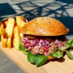 INGREDIENTE: Chiflă proaspătă unsă cu unt + Sos Smoky Furgoneta + Valeriană + Pulled pork + Salată pinky coleslaw + Castraveți murați + Jalapeno + Sos cherry BBQ